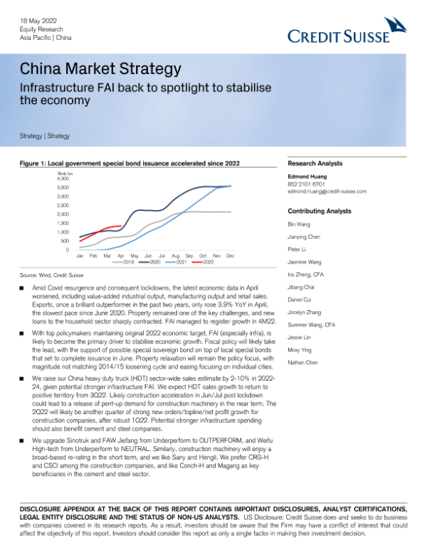 【瑞信】【20220518】瑞信-中国投资策略-基础设施FAI重新成为焦点以稳定经济-26页 宏观策略
