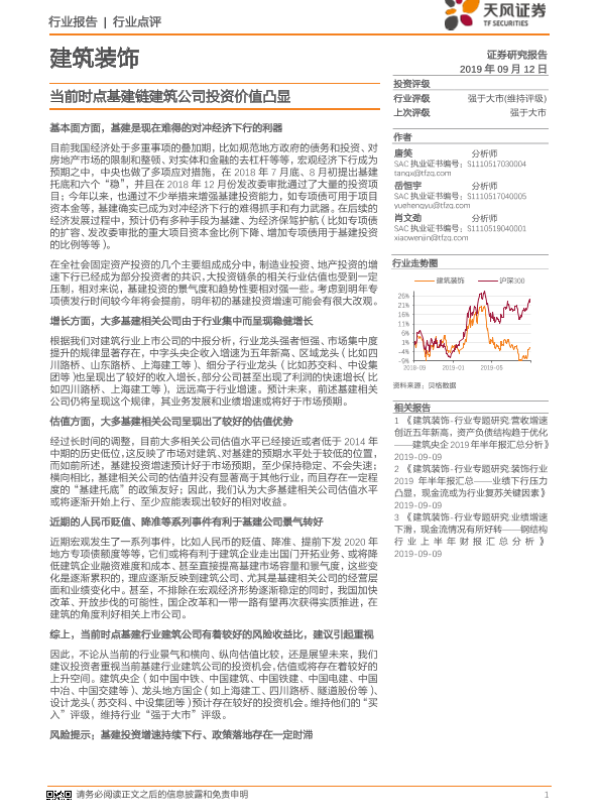 【天风证券】【20190912】建筑装饰行业点评:当前时点基建链建筑公司投资价值凸显-3页 行业研究