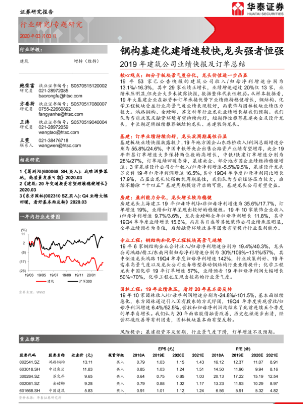【华泰证券】【20200303】2019年建筑公司业绩快报及订单总结:钢构基建化建增速较快,龙头强者恒强-4页 行业研究