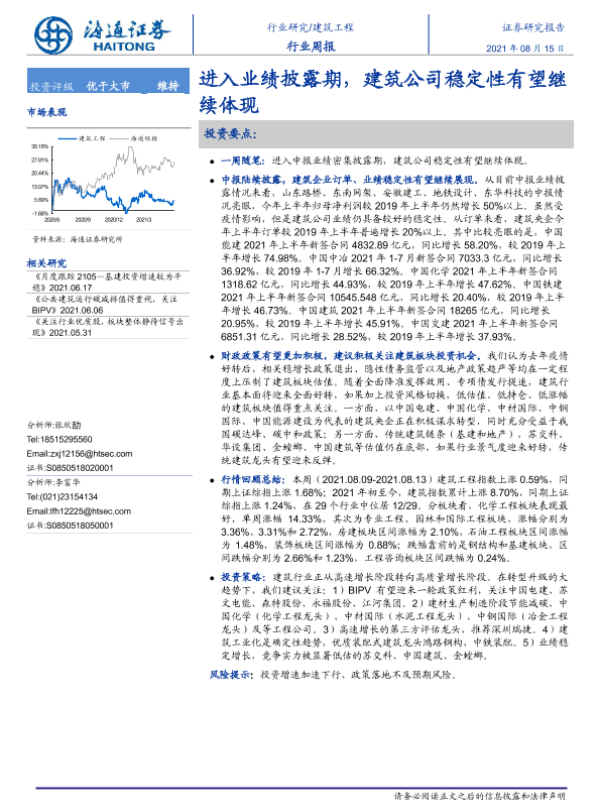 【海通证券】【20210815】建筑工程行业周报:进入业绩披露期,建筑公司稳定性有望继续体现-6页 行业研究