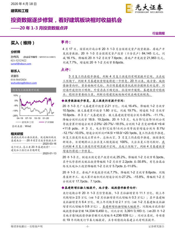 【光大证券】【20200418】建筑和工程20年1-3月投资数据点评:投资数据逐步修复,看好建筑板块相对收益机会-5页 行业研究
