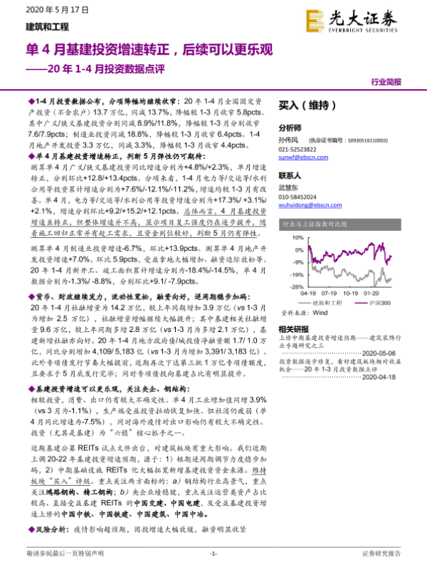 【光大证券】【20200517】20年1-4月投资数据点评-单4月基建投资增速转正,后续可以更乐观-4页 行业研究