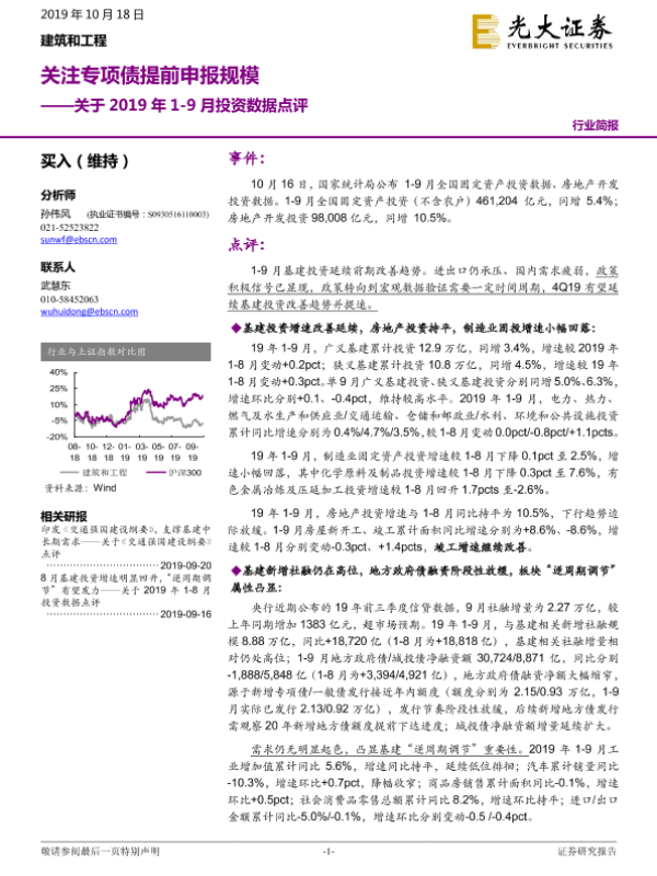 【光大证券】【20191018】关于2019年1-9月投资数据点评:关注专项债提前申报规模-4页 行业研究
