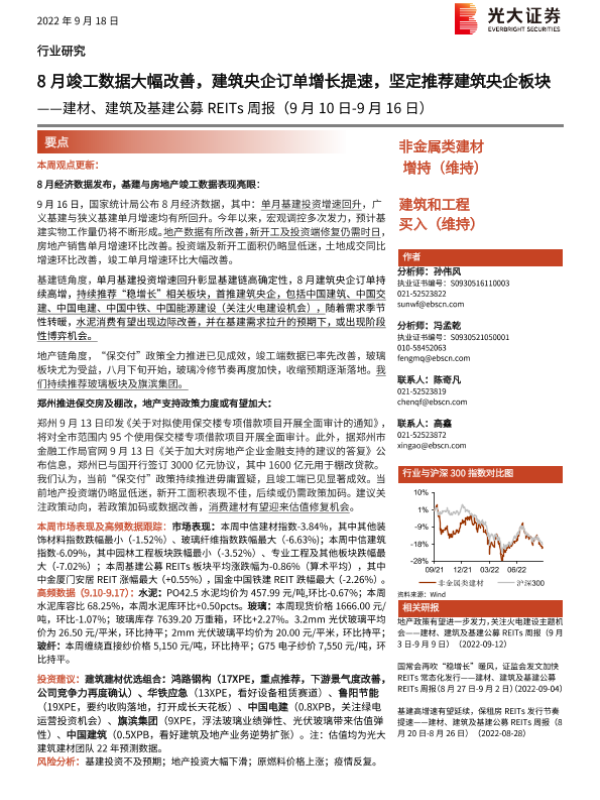 【光大证券】【20220918】建材、建筑及基建公募REITs周报:8月竣工数据大幅改善,建筑央企订单增长提速,坚定推荐建筑央企板块-19页 行业研究