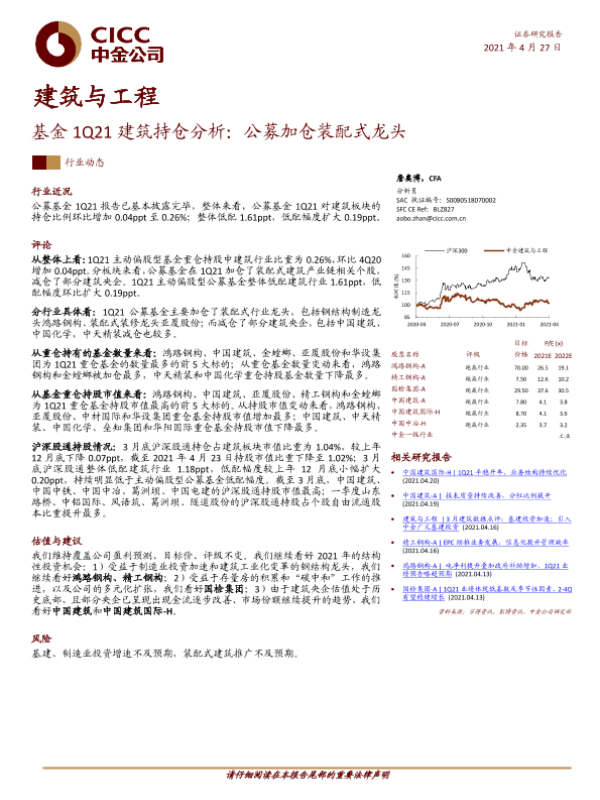 【中金公司】【20210427】基金1Q21建筑持仓分析:公募加仓装配式龙头-10页 行业研究