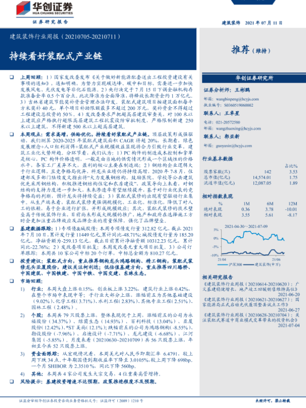 【华创证券】【20210711】建筑装饰行业周报:持续看好装配式产业链-19页 行业研究