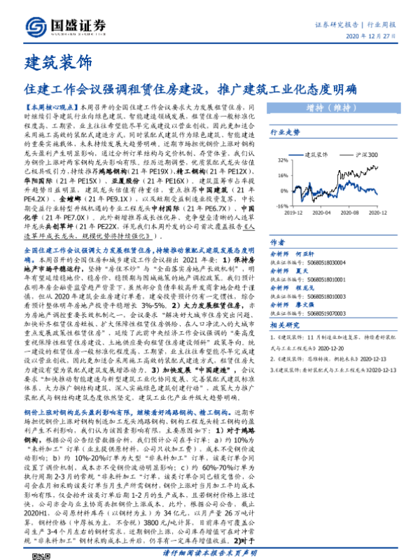 【国盛证券】【20201227】建筑装饰行业周报:住建工作会议强调租赁住房建设,推广建筑工业化态度明确-14页 行业研究