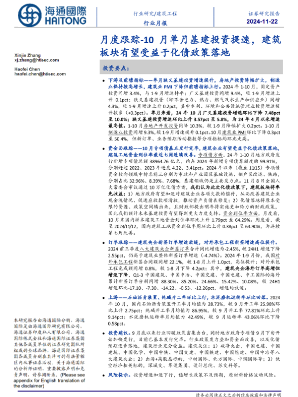 【海通国际】【20241122】建筑工程行业月度:10月单月基建投资提速,建筑板块有望受益于化债政策落地-24页 行业研究