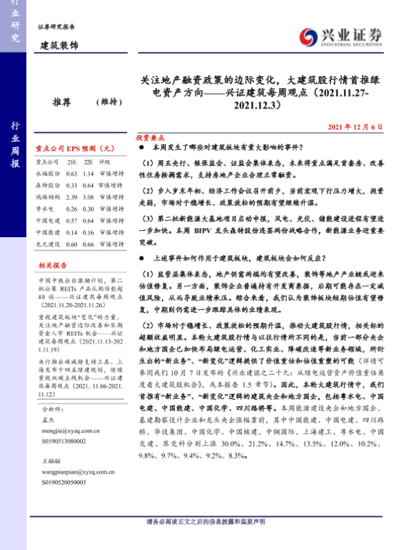 【兴业证券】【20211206】关注地产融资政策的边际变化,大建筑股行情首推绿电资产方向-41页 行业研究