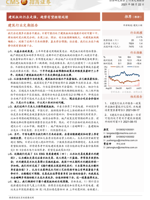 【海通证券】【20210822】建筑行业定期报告:建筑板块仍在走强,趋势有望继续延续-3页 行业研究