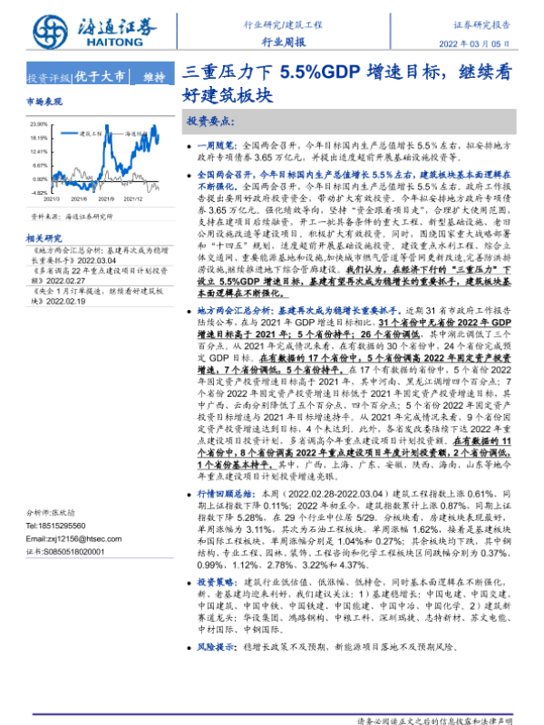 【海通证券】【20220305】建筑工程行业周报:三重压力下5.5%GDP增速目标,继续看好建筑板块-6页 行业研究