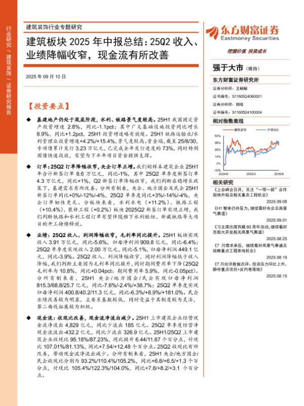 【东方财富证券】【202509】建筑装饰行业专题研究-建筑板块2025年中报总结:25Q2收入、业绩降幅收窄,现金流有所改善-21页 证券期货研究报告