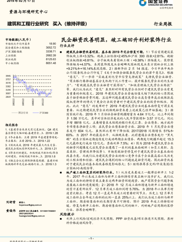 【国金证券】【20190217】建筑和工程行业研究周报:民企融资改善明显,竣工端回升利好装饰行业-11页 行业研究