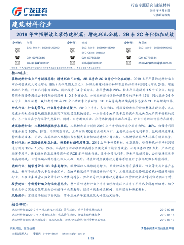 【广发证券】【20190908】2019年中报解读之装饰建材篇:增速环比企稳,2B和2C分化仍在延续-23页 行业研究
