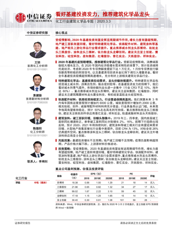 【中信证券】【20200303】20200303-中信证券-化工行业建筑化学品专题:看好基建投资发力,推荐建筑化学品龙头-30页 行业研究