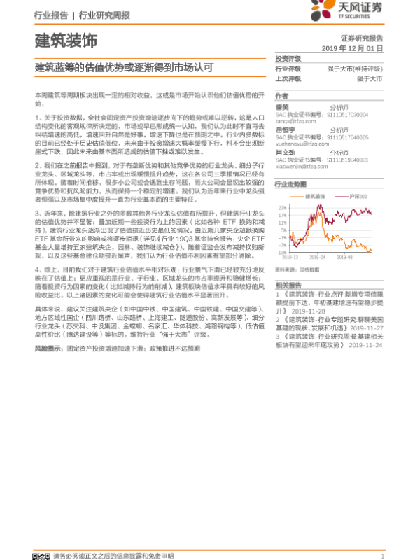 【天风证券】【20191201】建筑装饰行业研究周报:建筑蓝筹的估值优势或逐渐得到市场认可-2页 行业研究