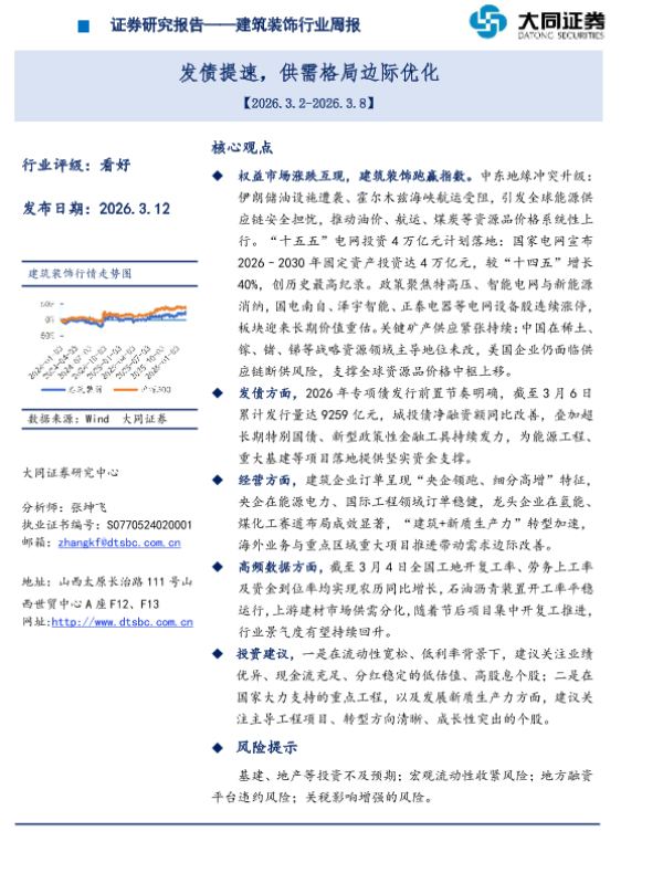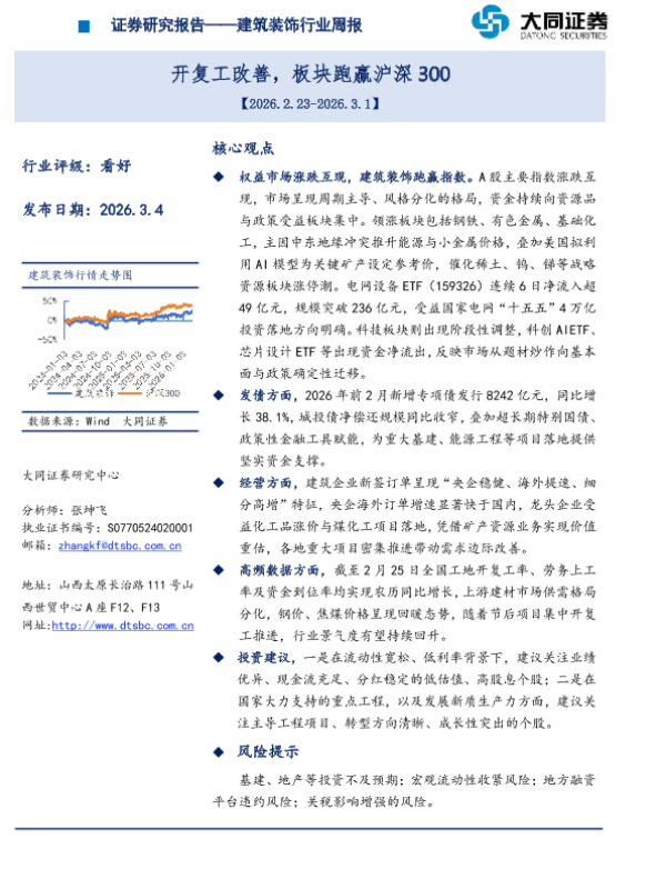 【大同证券】【202603】建筑装饰行业周报:开复工改善,板块跑赢沪深300-14页 证券期货研究报告