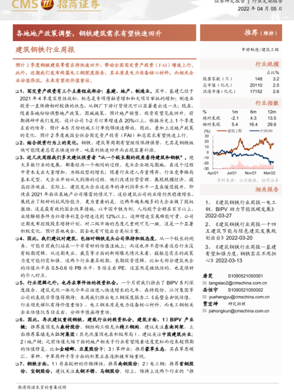 【海通证券】【20220405】建筑钢铁行业周报:各地地产政策调整,钢铁建筑需求有望快速回升-3页 行业研究