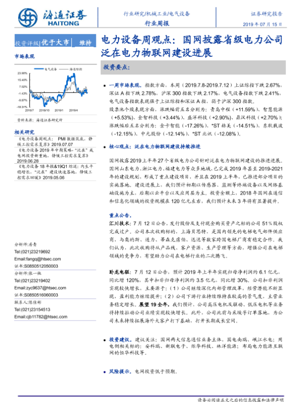 【海通证券】【20190715】电力设备周观点:国网披露省级电力公司泛在电力物联网建设进展-3页 行业研究