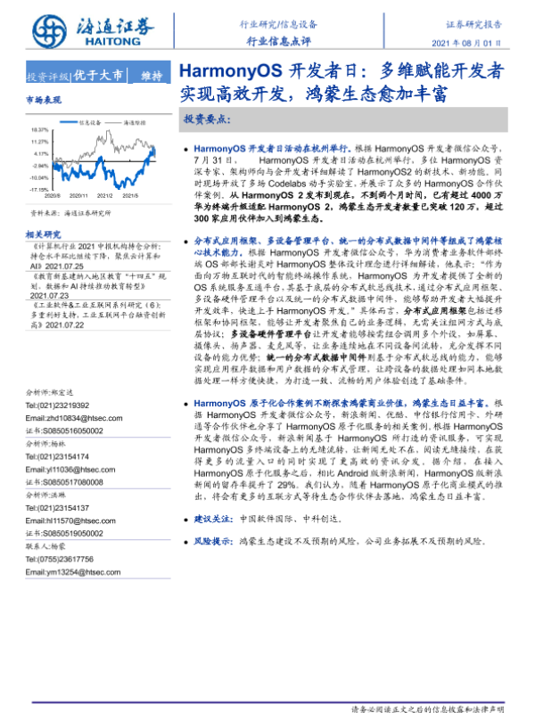 【海通证券】【20210801】计算机行业信息点评:HarmonyOS开发者日:多维赋能开发者实现高效开发,鸿蒙生态愈加丰富-2页 行业研究