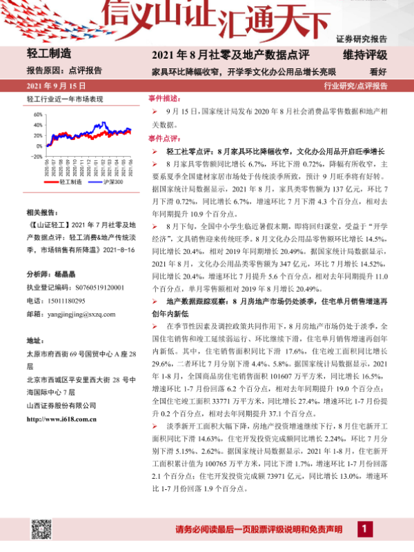 【山西证券】【20210915】轻工制造2021年8月社零及地产数据点评:家具环比降幅收窄,开学季文化办公用品增长亮眼-6页 行业研究