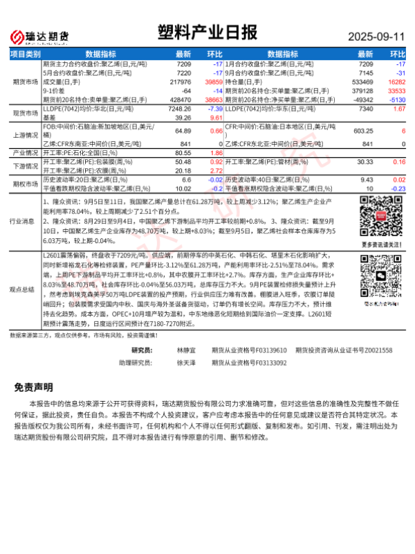 【瑞达期货】【202509】塑料产业日报-250911-1页 证券期货研究报告