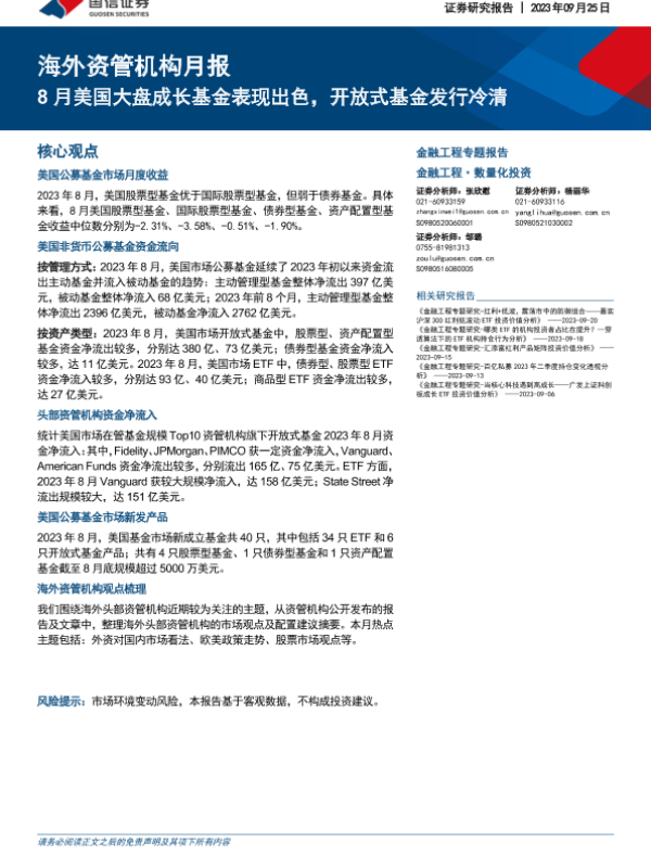 【国信证券】【20230925】海外资管机构月报:8月美国大盘成长基金表现出色,开放式基金发行冷清-16页 行业研究