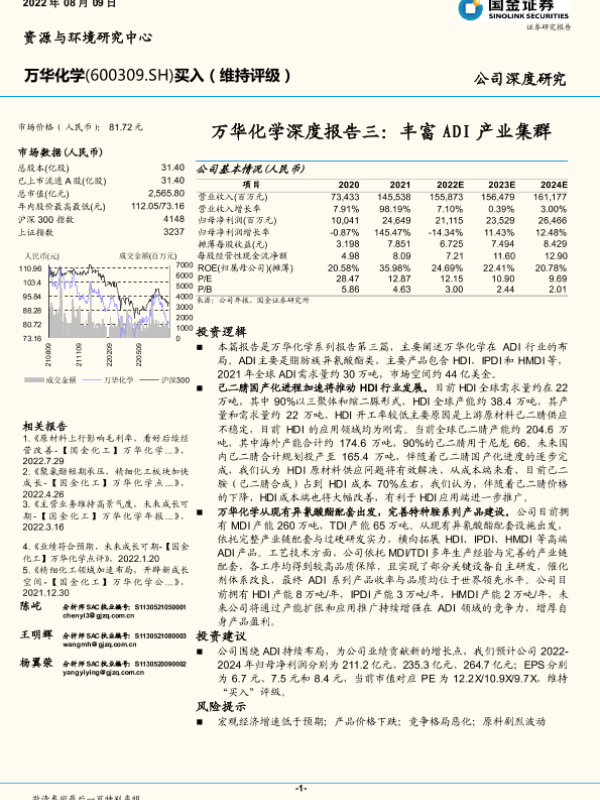 【国金证券】【20220809】万华化学深度报告三:丰富ADI产业集群-25页 行业研究