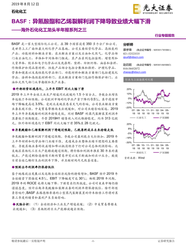 【光大证券】【20190812】BASF:异氰酸酯和乙烯裂解利润下降导致业绩大幅下滑-8页 行业研究