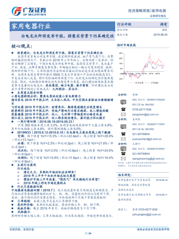 【广发证券】【20190825】家用电器行业:白电龙头即将发布中报,弱需求背景下仍具确定性-24页 行业研究