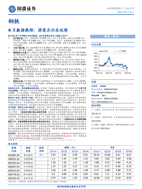 【国盛证券】【20220516】钢铁4月数据跟踪:弱需求仍在延续-3页 行业研究