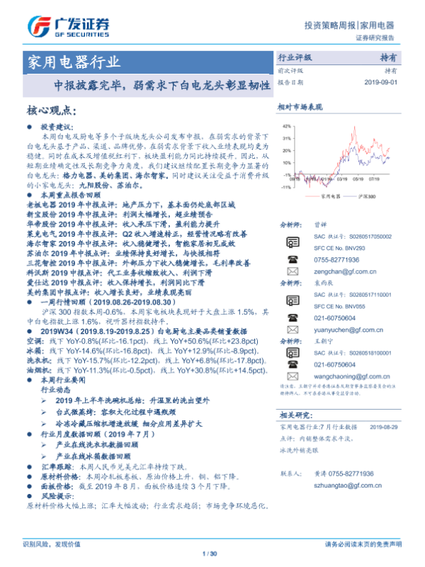 【广发证券】【20190901】20190901-广发证券-家用电器行业投资策略周报:中报披露完毕,弱需求下白电龙头彰显韧性-30页 行业研究