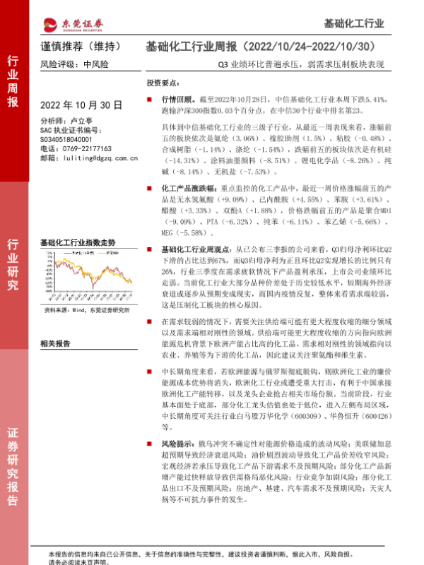 【东莞证券】【20221030】20221030-东莞证券-基础化工行业周报:Q3业绩环比普遍承压,弱需求压制板块表现-12页 行业研究