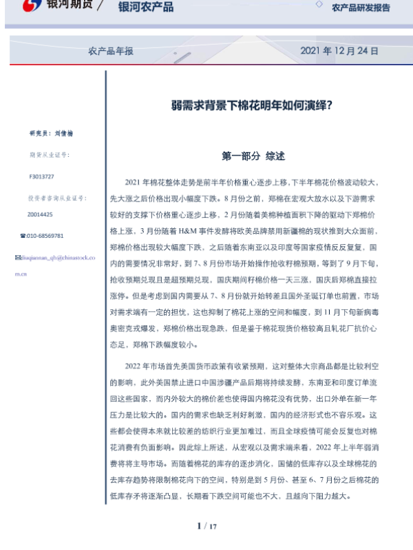 【银河期货】【20211224】弱需求背景下棉花明年如何演绎?-17页 行业研究