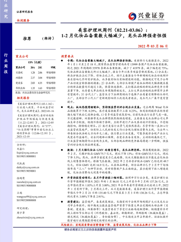 【兴业证券】【20220306】美容护理双周刊:1-2月化妆品备案数大幅减少,龙头品牌强者恒强-20页 行业研究