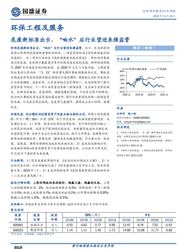 【国盛证券】【20191124】环保工程及服务行业周报:危废新标准出台,“响水”后行业望迎来强监管-11页 行业研究