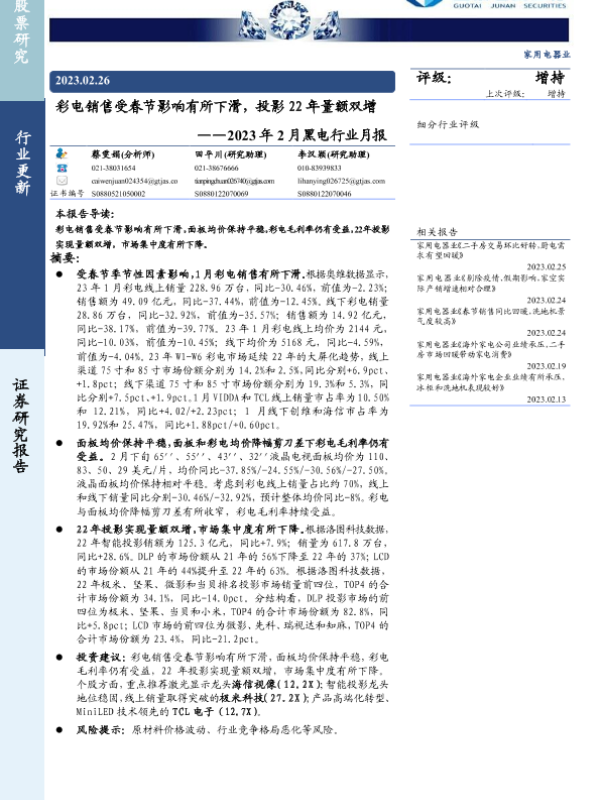 【国泰君安证券】【20230226】2023年2月黑电行业月报:彩电销售受春节影响有所下滑,投影22年量额双增-12页 行业研究