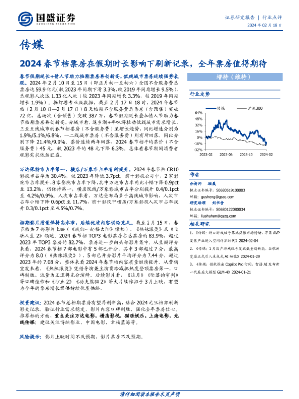 【国盛证券】【20240218】2024春节档票房在假期时长影响下刷新记录,全年票房值得期待-14页 行业研究
