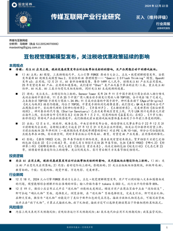 【国金证券】【20241222】传媒互联网产业行业周报:豆包视觉理解模型发布,关注税收优惠政策延续的影响-10页 行业研究