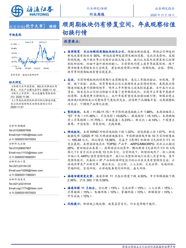 【海通证券】【20201116】20201116-海通证券-传媒行业周报:顺周期板块仍有修复空间,年底观察估值切换行情-11页 行业研究