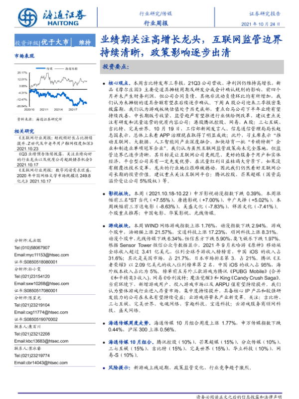 【海通证券】【20211024】20211024-海通证券-传媒行业周报:业绩期关注高增长龙头,互联网监管边界持续清晰,政策影响逐步出清-10页 行业研究