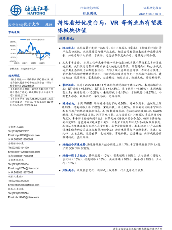 【海通证券】【20220807】持续看好优质白马,VR等新业态有望提振板块估值-10页 行业研究