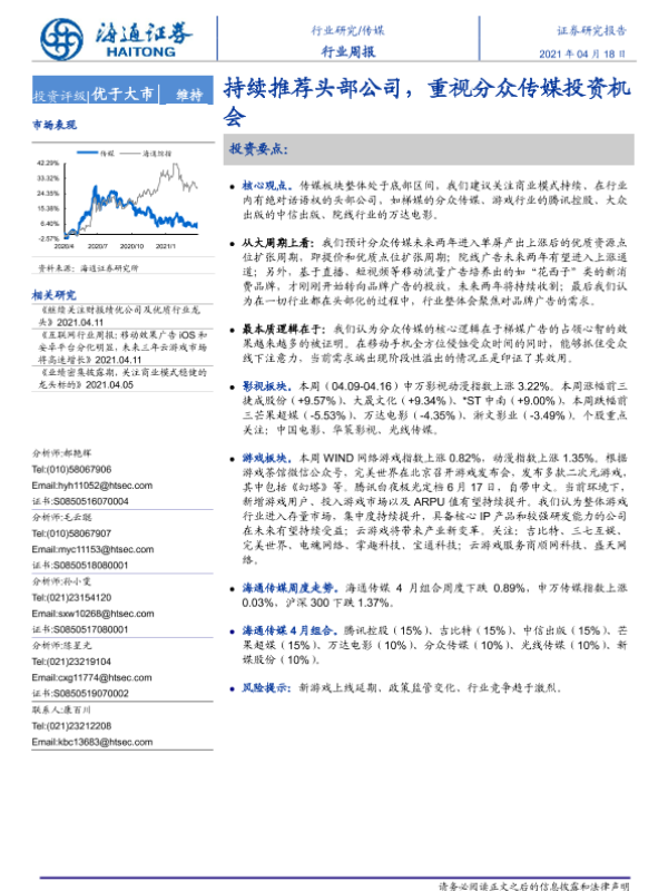 【海通证券】【20210418】20210418-海通证券-传媒行业周报:持续推荐头部公司,重视分众传媒投资机会-10页 行业研究