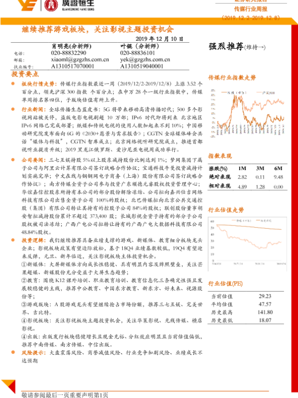 【广证恒生】【20191210】传媒行业周报:继续推荐游戏板块,关注影视主题投资机会-19页 行业研究