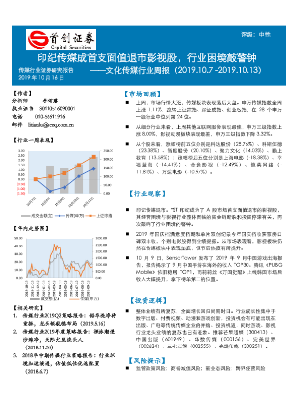 【首创证券】【20191016】20191016-首创证券-文化传媒行业周报:印纪传媒成首支面值退市影视股,行业困境敲警钟-11页 行业研究