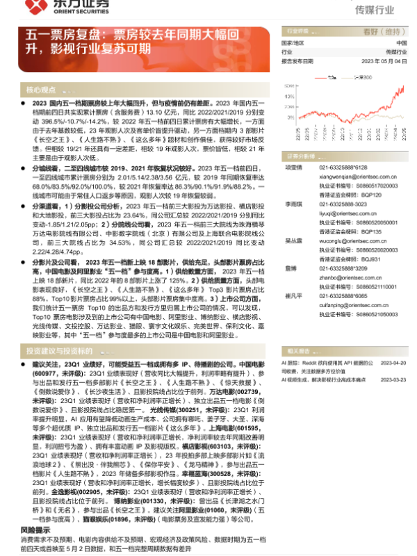 【东方证券】【20230504】传媒行业动态跟踪:五一票房复盘-11页 行业研究