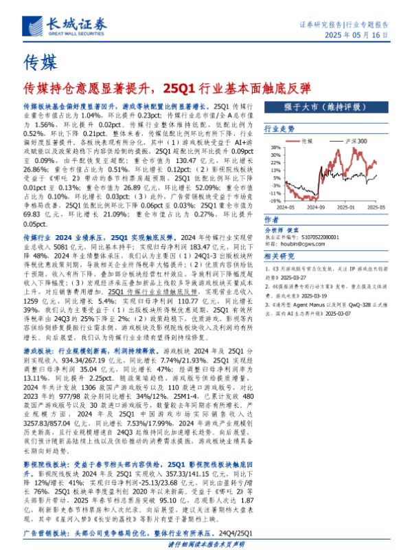 【长城证券】【20250516】传媒行业:传媒持仓意愿显著提升,25Q1行业基本面触底反弹-34页 证券期货研究报告