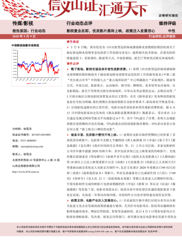 【山西证券】【20200509】传媒行业动态点评:影院复业在即,优质影片亟待上映,政策注入发展信心-5页 行业研究
