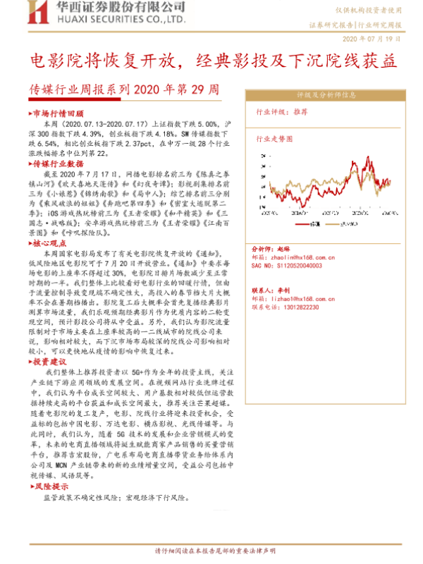 【华西证券】【20200719】20200719-华西证券-传媒行业周报系列2020年第29周:电影院将恢复开放,经典影投及下沉院线获益-16页 行业研究