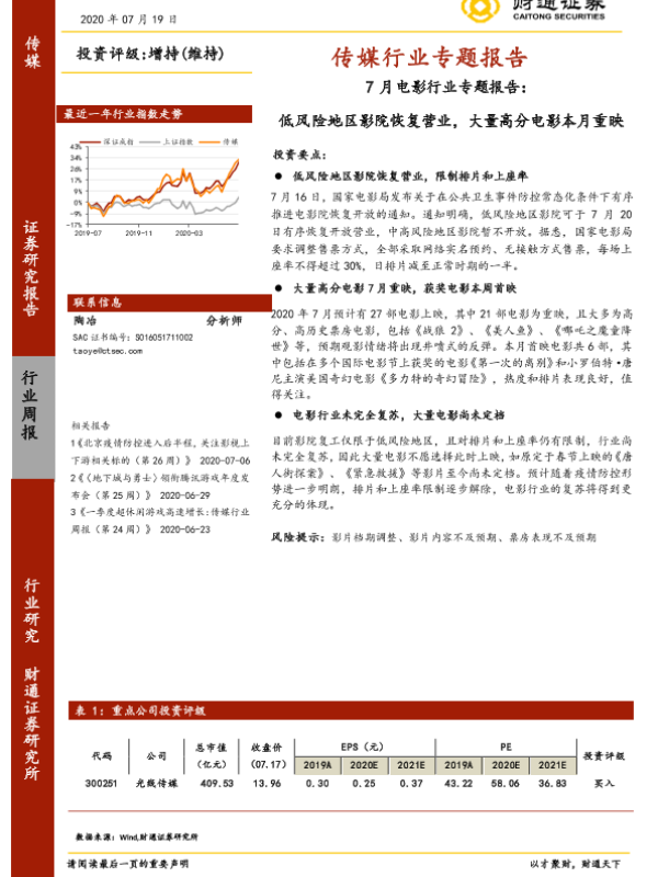 【财通证券】【20200719】7月电影行业专题报告:低风险地区影院恢复营业,大量高分电影本月重映-8页 行业研究
